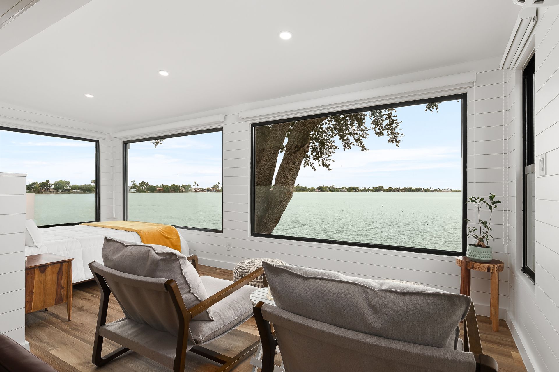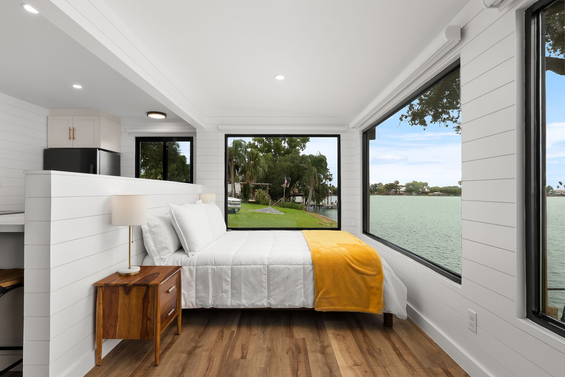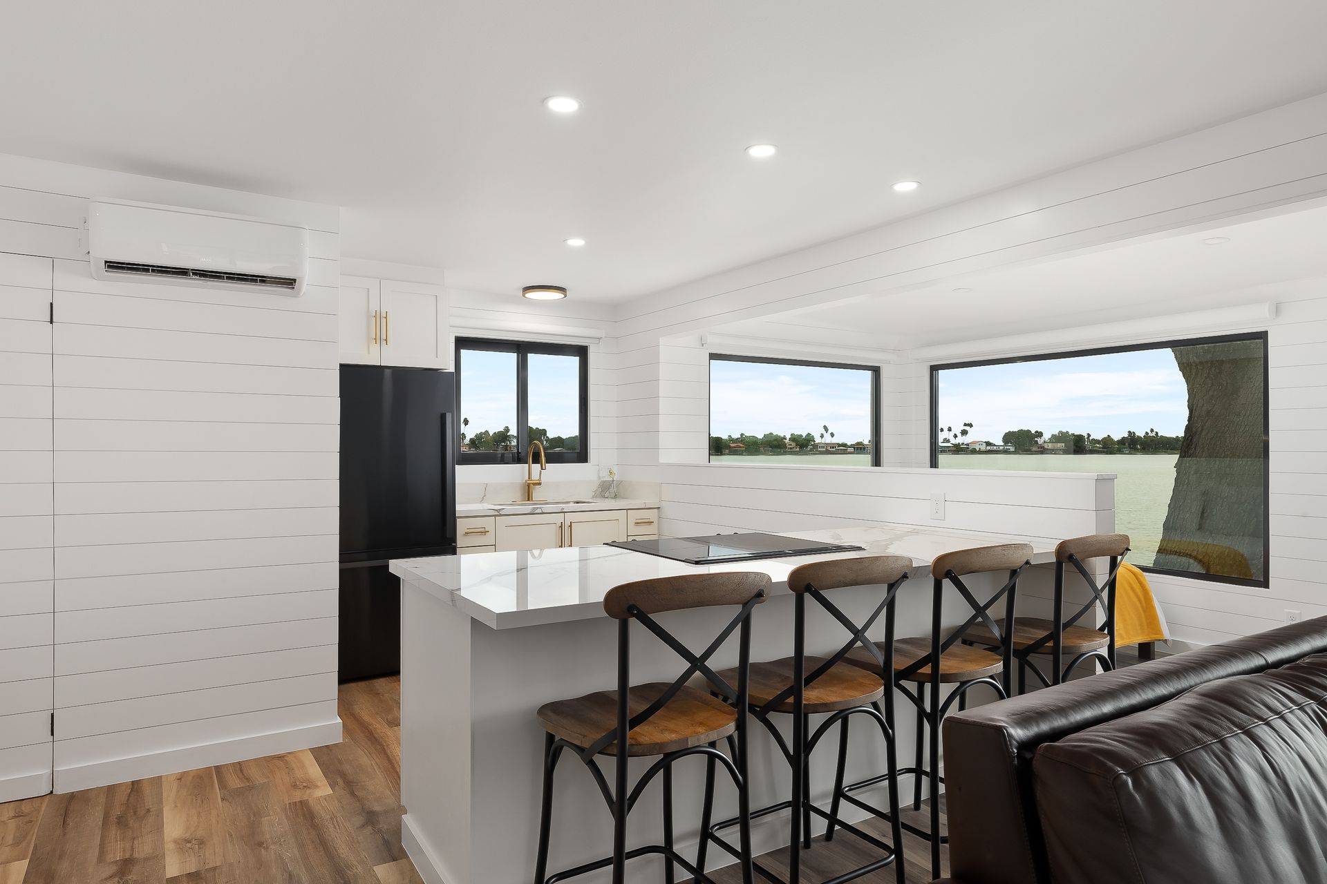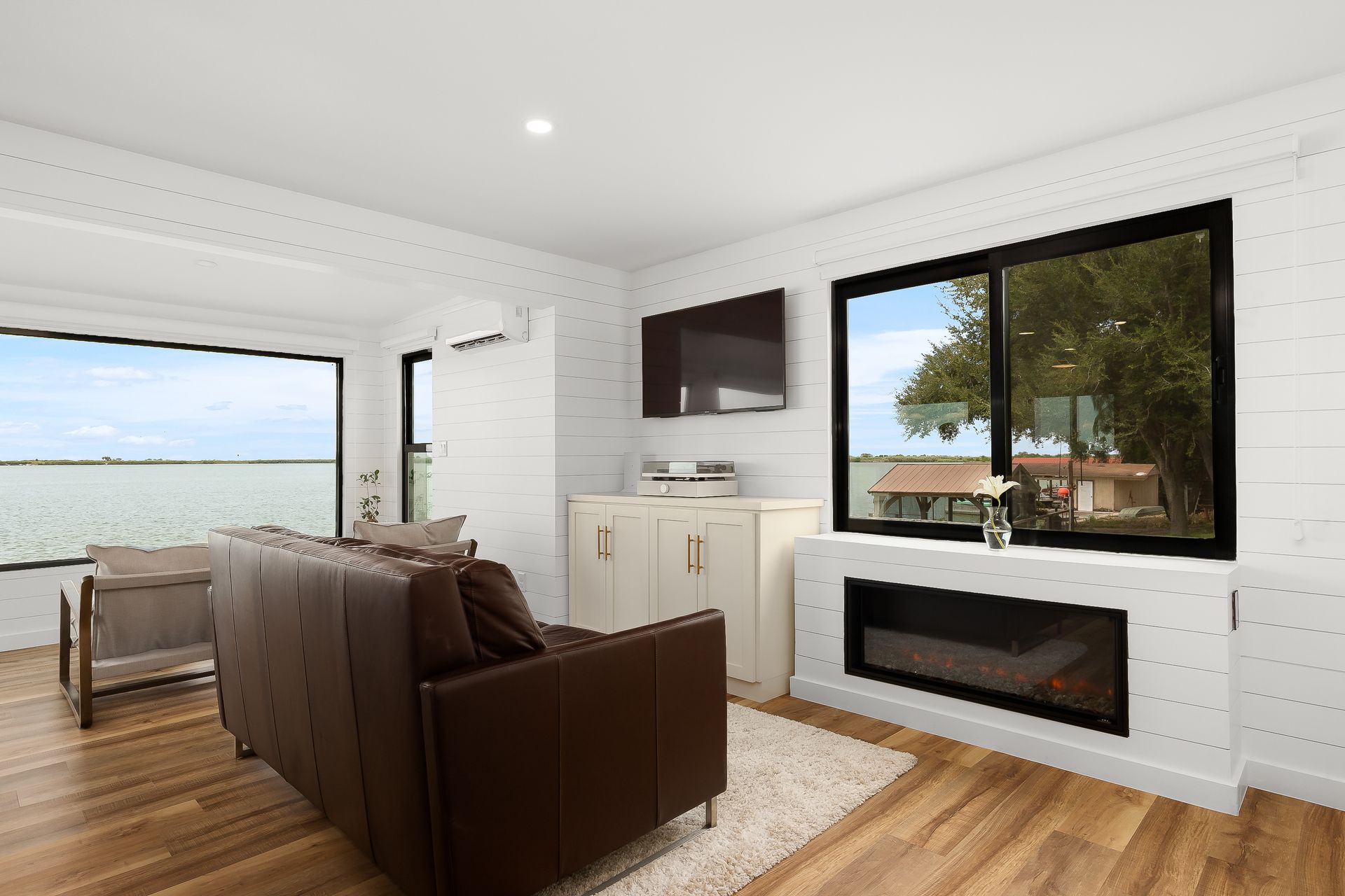 A 500 SF abandoned fishing cabin turned into into a dream tiny home with panoramic lake views. We* completely gutted the space inside and out, upgraded the foundation, plumbing, electrical, and mechanical components of this structure. Shiplap walls, custom built-ins for storage, porcelain countertops, custom windows, and a fireplace has this small space giving major vibes.