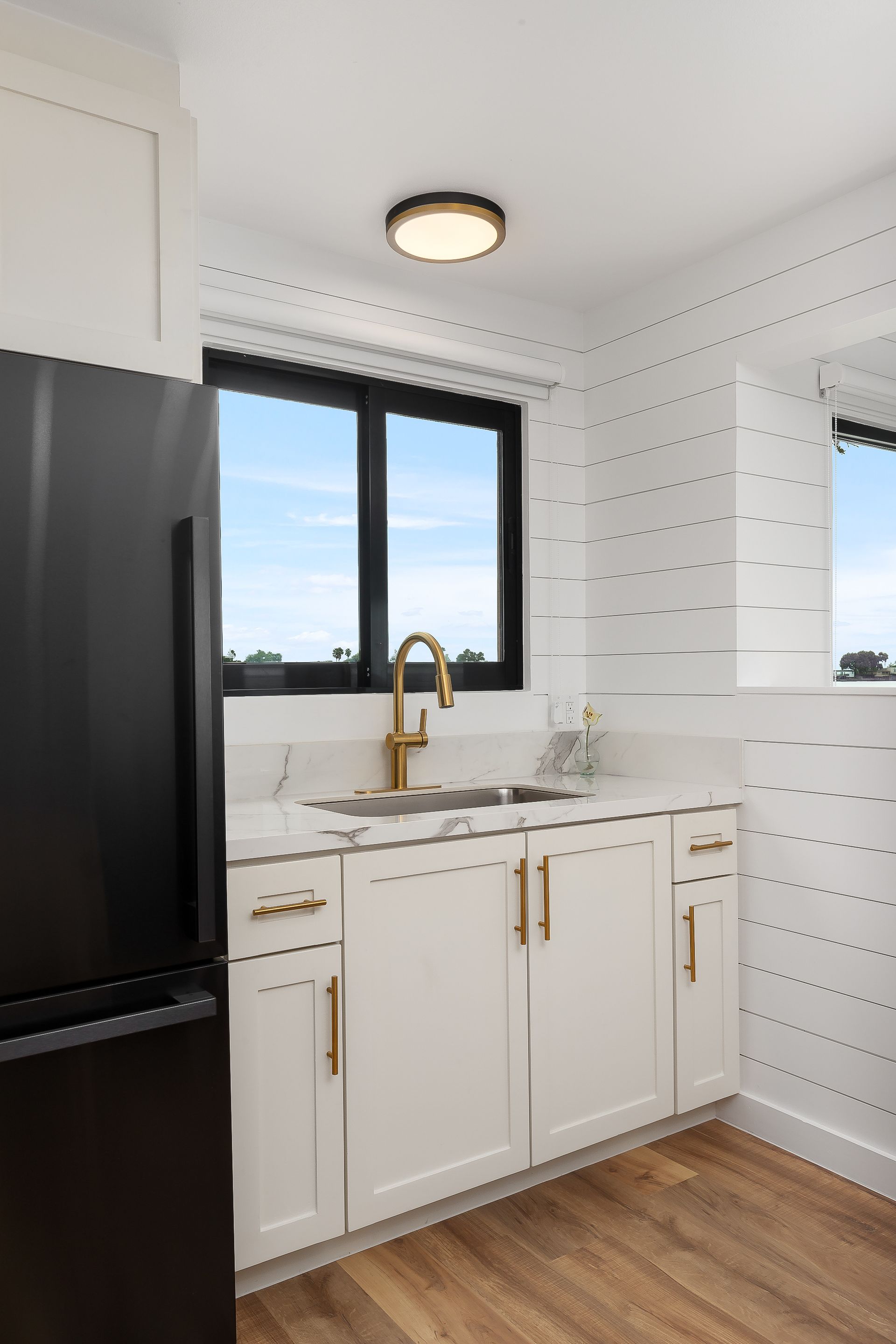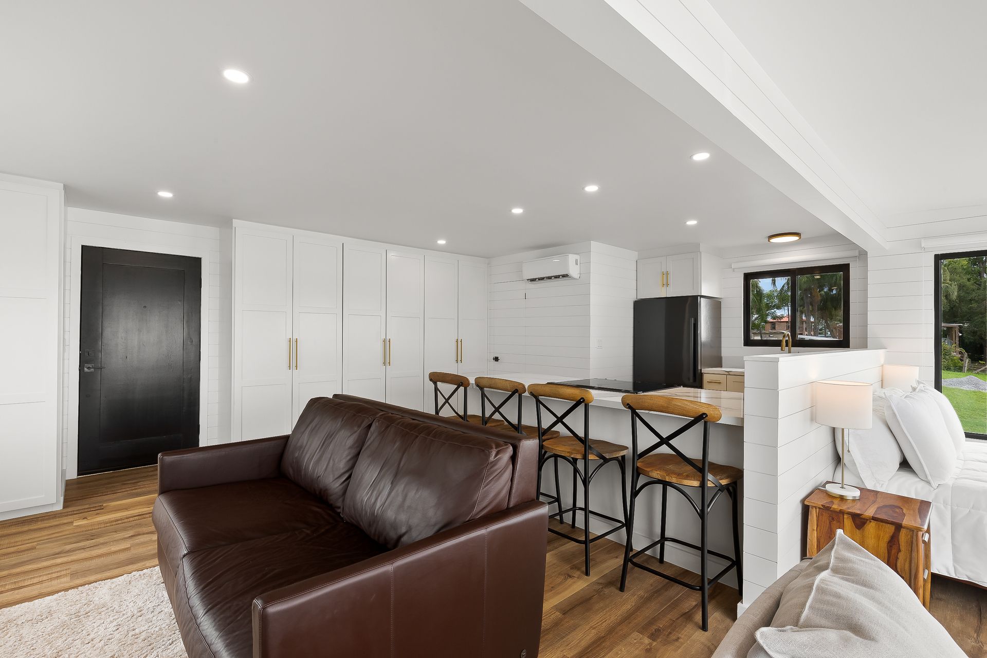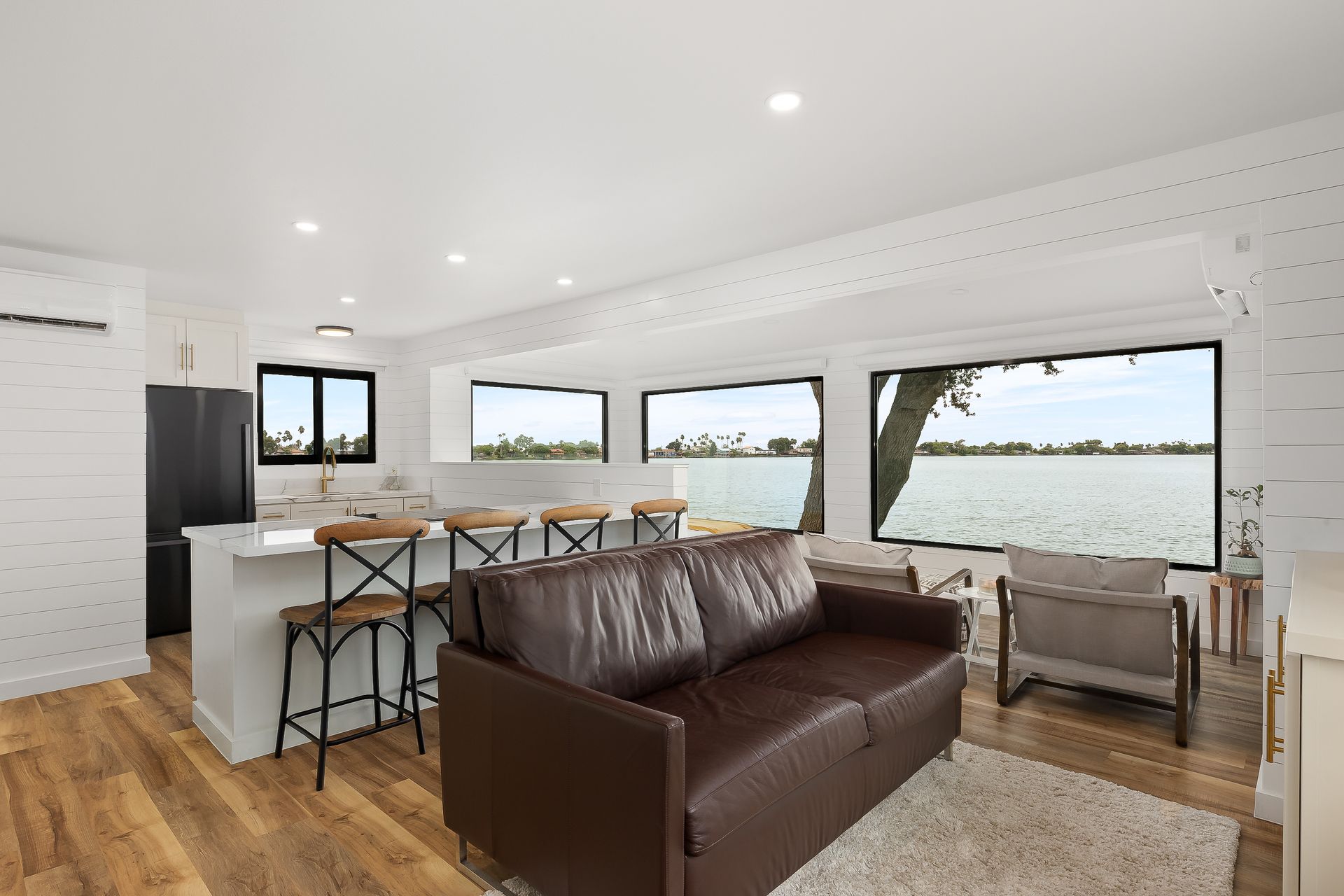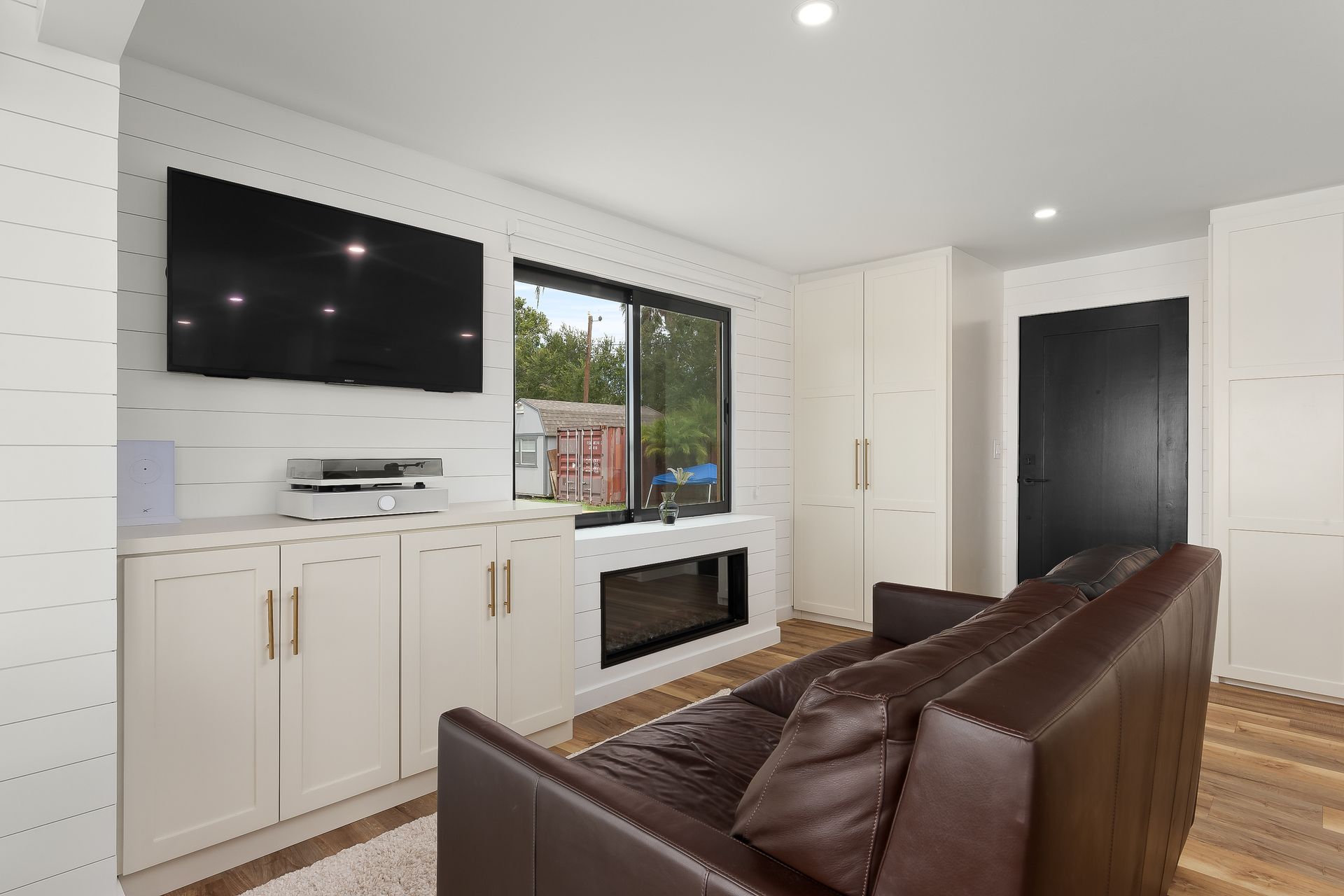 A 500 SF abandoned fishing cabin turned into into a dream tiny home with panoramic lake views. We* completely gutted the space inside and out, upgraded the foundation, plumbing, electrical, and mechanical components of this structure. Shiplap walls, custom built-ins for storage, porcelain countertops, custom windows, and a fireplace has this small space giving major vibes.