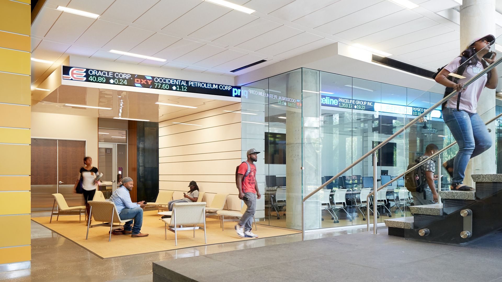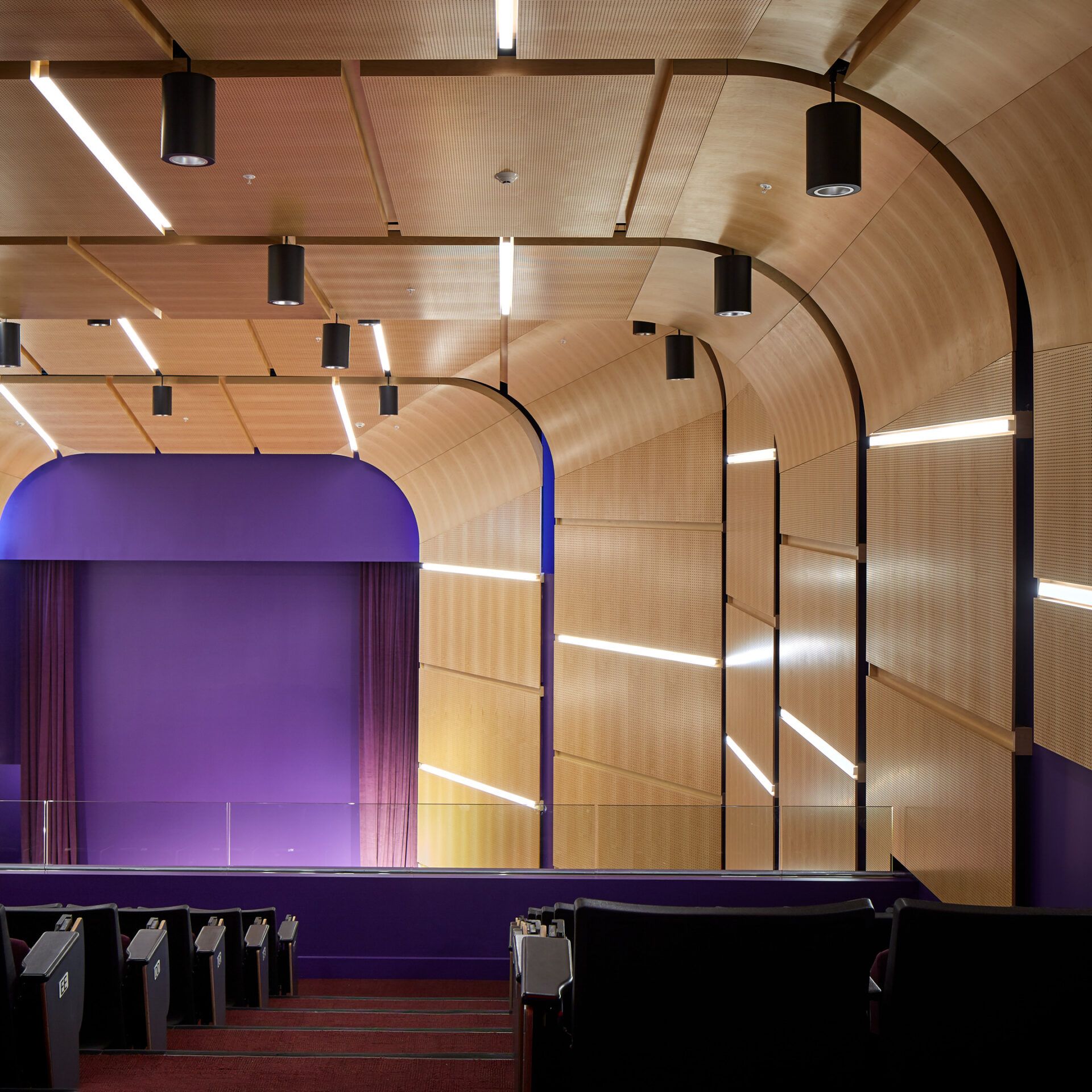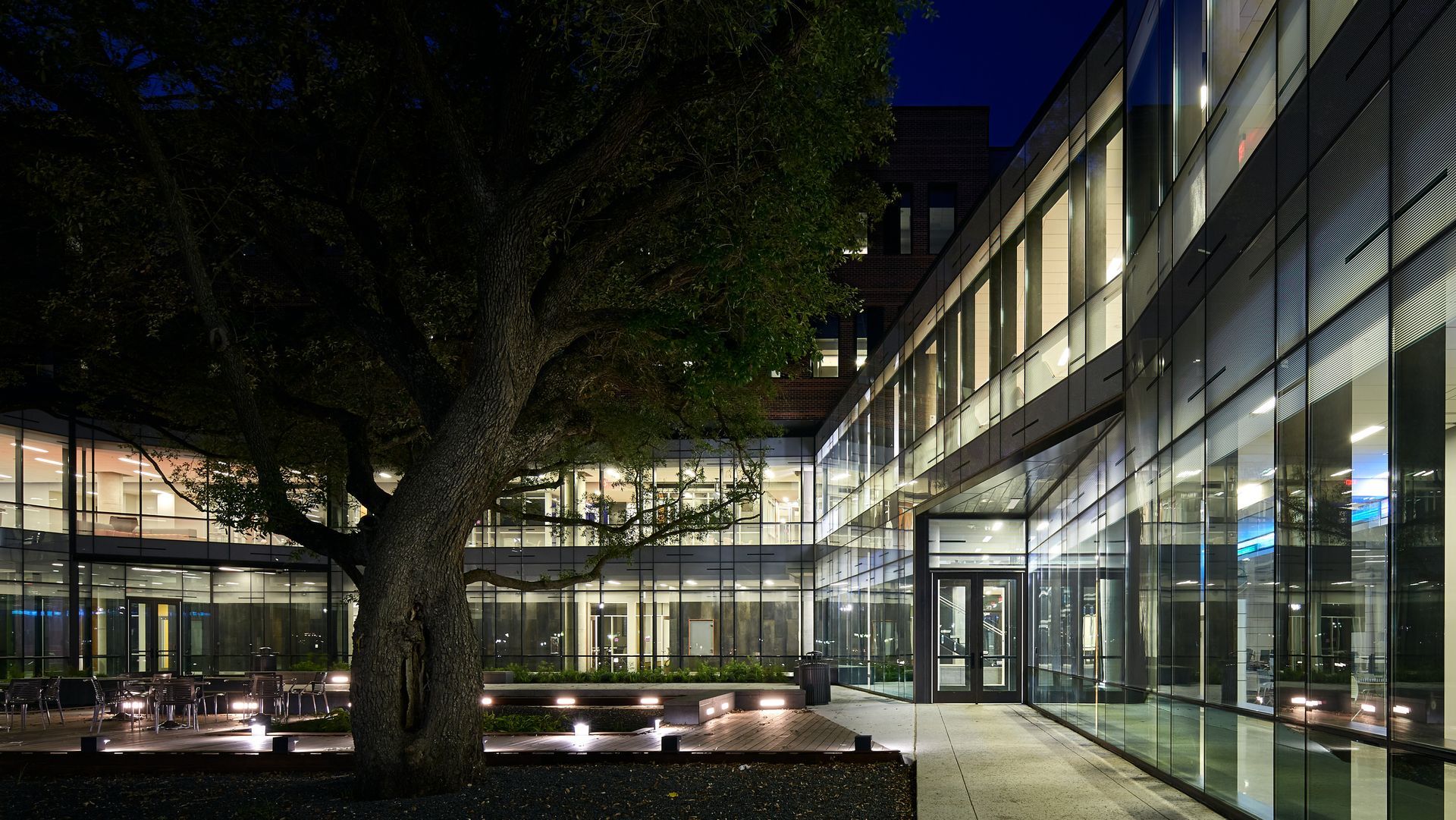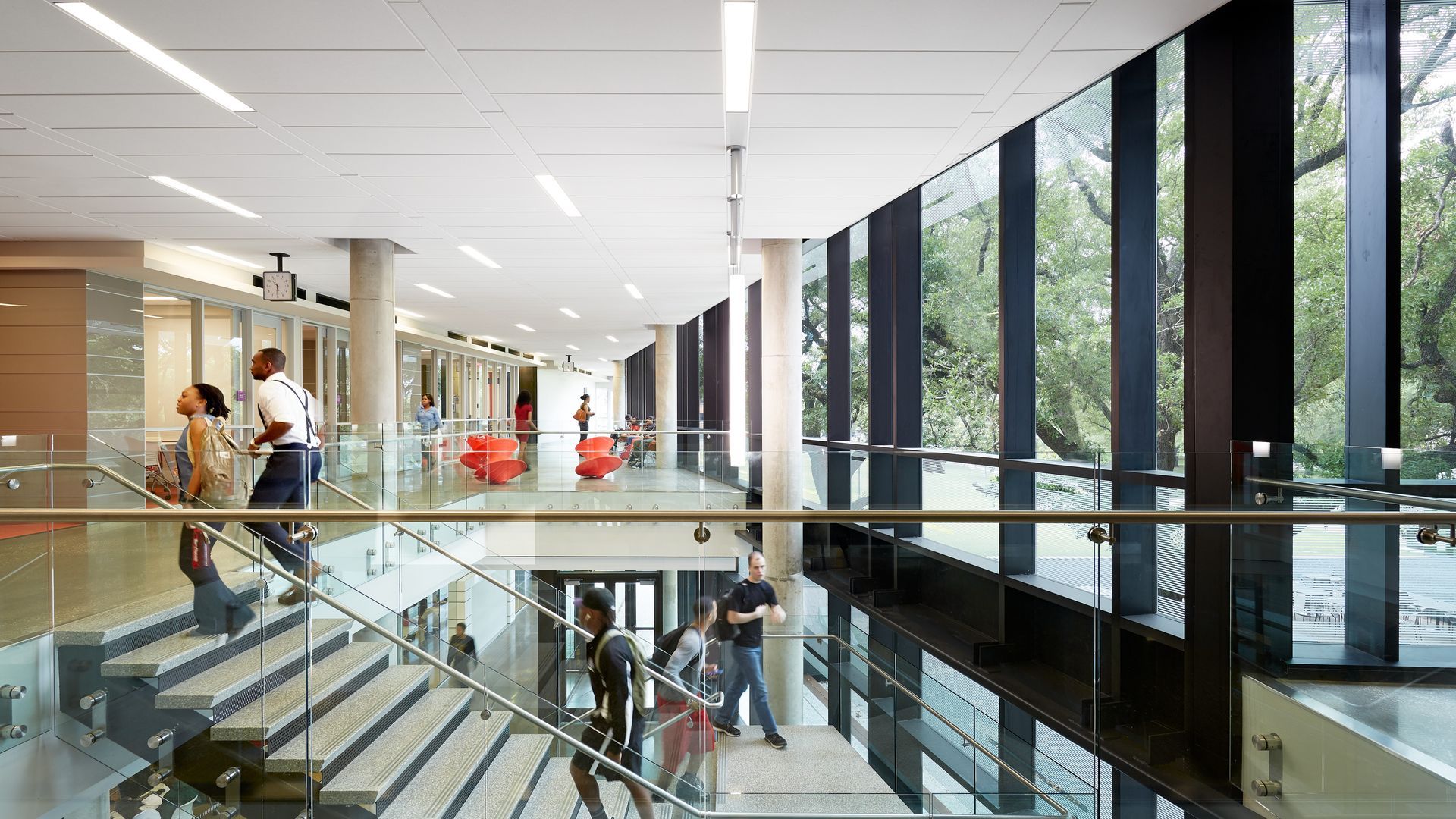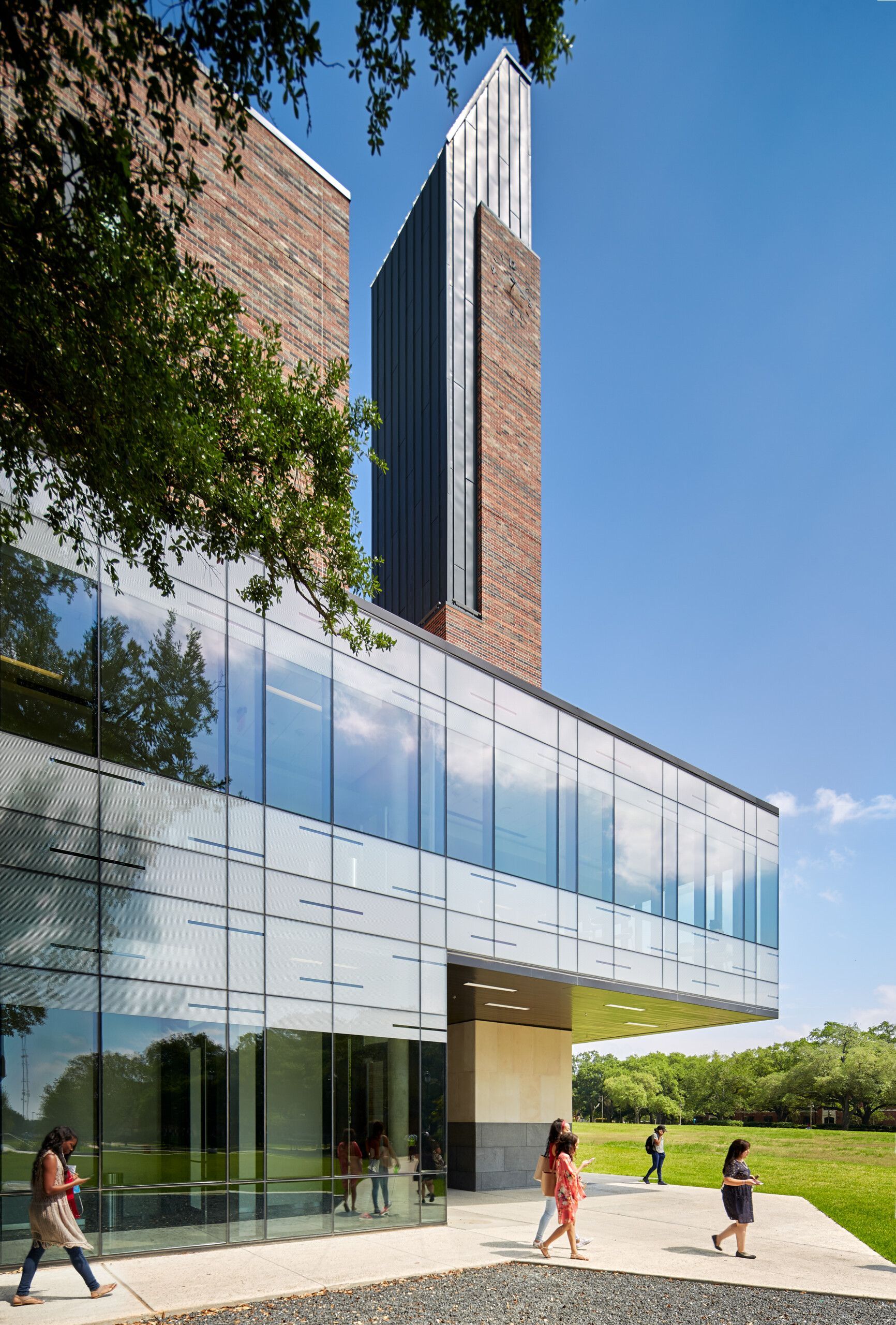 The state-of-the-art facility features a 102’ clock tower, two-level 400 seat auditorium, classrooms, meeting spaces, and faculty offices built around a group of mature oak trees in the center of campus. Ethny particularly enjoyed designing the multi-level steel staircase that "floats" seamlessly without any support in the intermediate levels.